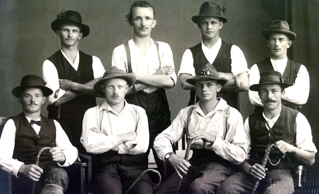 Säntis-Reise 1919 Zu Beginn des 20. Jahrhunderts nahm das Vereinsleben seinen gewohnten Gang. In regelmässigen Abständen wurden Versammlungen, Reisen und Abendunterhaltungen durchgeführt, ebenfalls wurde wieder eine Gesangssektion gegründet. Der erste Weltkrieg machte der Bevölkerung zu schafften, auch der Knabenverein litt darunter. Es konnten kaum Versammlungen abgehalten werden, ans Reisen und Singen war erst recht nicht zu denken. Hinzu kam, dass immer wieder Mitglieder vom Knabenverein an die Grenze gerufen wurden und dort ihren Dienst leisten mussten. Zudem gesellte sich die spanische Grippe hinzu, Todesopfer gab es in Kleinandelfingen glücklicherweise keine zu beklagen, jedoch viele Erkrankungen. Der Knabenverein versuchte dort zu helfen, wo die Not am grössten war. Nach Kriegsende und überstandener Grippe hatten die Knaben Mühe, den gewohnten Rhythmus zu finden. Erst gegen Ende der zwanziger Jahre nahmen die Vereinstätigkeiten wieder vermehrt zu, wie den Protokollen zu entnehmen ist.
